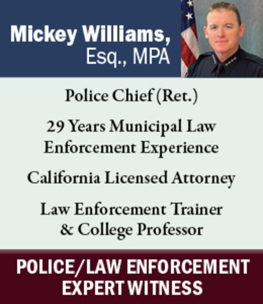 Mickey Williams is a retired Police Chief with 29 years of municipal law enforcement experience. Mickey is a licensed California attorney who has extensive experience as a law enforcement trainer and college professor. Mickey offers expert witness services and consultation regarding case evaluation and strategy, incident evaluation, personnel issues, risk management concerns, and policing best practices. Mickey also conducts all types of investigations.