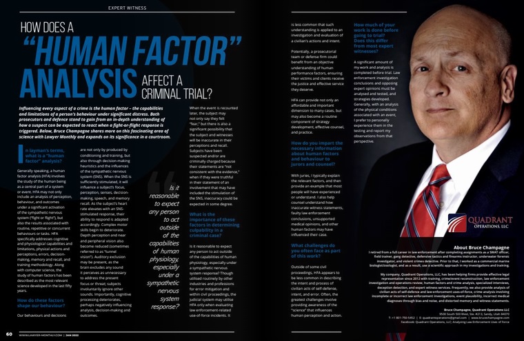As a decorated law enforcement officer with service in both urban and rural municipal agencies and a county sheriff’s department, Bruce Champagne has completed assignments as a field training officer, patrol and investigations supervisor, corrections officer and supervisor, criminal gang investigator, forensic diver, major crimes detective, civilian review board representative, SWAT leader and member, and firearms/defensive tactics instructor. Bruce was a previous president of the Utah Tactical Officers Association, Utah Gang Investigators Association, Utah Forensic Divers Association, and Utah Peace Officers Association. Bruce is a member of the International Law Enforcement Educators and Trainers Association (ILEETA), Academy of Criminal Justice Sciences, International Association of Forensic Criminologists, Association of Force Investigators, Society for Integrity in Force Investigation and Reporting, and National Tactical Officers Association (NTOA), and is a certified instructor in firearms, collapsible batons, aerosols, arrest control, and various law enforcement and civilian defensive tactics and martial arts systems. In addition to a Master of Public Administration degree, Bruce previously earned a Bachelor of Science degree in Marine Biology and graduated from the National Police Corps Leadership Development School. Bruce earned a professional diploma in Crime Analysis and Behavioral Profiling and was an adjunct criminal justice instructor at Provo College and has been a national law enforcement-topic panelist in conferences held in Washington D.C. and Atlanta, Georgia. Using a cross-disciplinary approach, Bruce has investigated multiple, officer-involved critical incidents as a certified Force Science Analyst and In-Custody Death Investigator, cold cases, civilian uses-of-force, and has assisted multiple legal defense firms in multiple states with analysis and follow-up, and has experience as an expert witness in federal, state, and municipal courts.