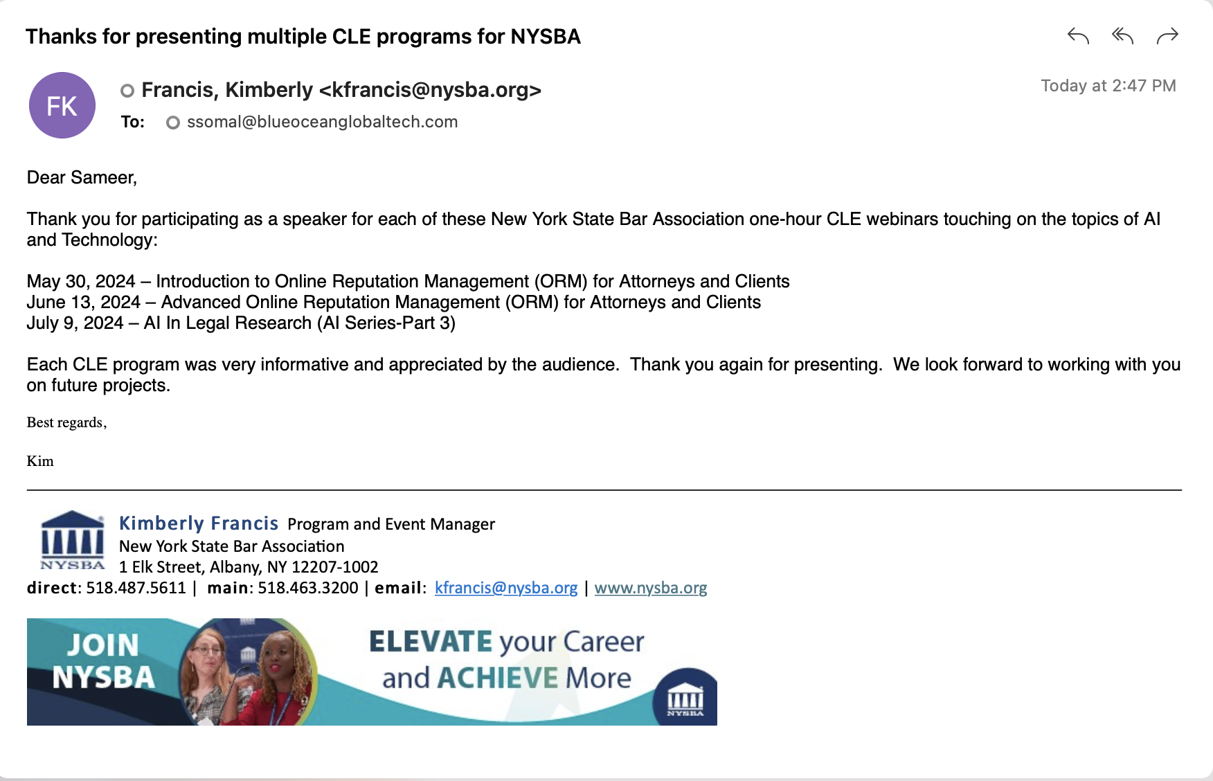 Sameer leads a 250+ member team at Blue Ocean Global Technology and Capital Expert Services, specializing in litigation consulting and expert witness engagements. Given the unique nature of each case, Sameer offers a competitive advantage through an integrated team approach, including legal research, data analytics, private investigations, digital forensics, financial analysis, academic insight, and interviews. His team is strategic with client resources, ensuring that reports are developed collaboratively to achieve a blended rate. Co-experts are added strategically on merit. When engaged directly, all reports and testimony reflect Sameer's independent professional opinions Sameer has consulted on 400+ cases and regularly delivers CLE programs for State Bar Associations. He is a former investment and private banker, which affords him a framework for calculating damages on a wide range of case mandates. Over the past decade, Sameer's responsibilities at CFA Institute include publishing articles, hosting their talk show, serving as a Senior Grader of CFA Level 3 exams, and speaking to 60+ CFA global societies. Past testifying experience includes federal, state, civil and arbitration courts. Sameer has testified against META, handled prominent/celebrity cases, and was requested by a former US president. Most of his cases settle before trial. As an Abraham Lincoln student and scholar, Sameer frequently integrates Mr. Lincoln’s writings, logic, and narratives to illustrate and reinforce key points in expert reports and courtroom testimony. His most recent article on Mr. Lincoln, entitled Abraham Lincoln: A model for ethical leadership, was published by the American Bar Association in February 2025 (pdf available on this profile). Bio: Sameer Somal is the CEO of Blue Ocean Global Technology and Co-Founder of Girl Power Talk. He is a CFA Charterholder, a CFP® professional, and a Chartered Alternative Investment AnalystSM. Sameer leads client engagements focused on digital transformation, risk management, and technology development. A testifying subject matter expert witness in economic damages, intellectual property, and internet defamation, he authors CLE programs with the Philadelphia Bar Foundation. Sameer is a frequent speaker at private industry and public sector conferences, including engagements with the Federal Home Loan Bank (FHLB), Global Digital Marketing Summit, IBM, New York State Bar Association (NYBSA), US Defense Leadership Forum, and US State Department’s Foreign Service Institute. He proudly serves on the Board of Directors of Future Business Leaders of America (FBLA) and Girl Power USA. Committed to building relationships, Sameer is an active member of the Abraham Lincoln Association (ALA), Academy of Legal Studies in Business (ALSB), American Bar Association (ABA), American Marketing Association (AMA), Business Transition Council, International Trademark Association (INTA), and Society of International Business Fellows (SIBF). A graduate of Georgetown University, he held leadership roles at Bank of America, Morgan Stanley, and Scotiabank. Sameer is also a CFA Institute 2022 Inspirational Leader Award recipient and was named an Iconic Leader by the Women Economic Forum. You can view 100+ references on Sameer’s public LinkedIn profile. View a video client testimonial from Mark Scott, senior partner The Buchalter Law Firm in Orange County, CA. Mark shared his feedback on working with Sameer after receipt of his report and subsequent trial testimony on behalf of a prominent business client: https://youtu.be/MchehwV4vM0?si=JhiFFAR0qov7CfrK. Sameer recently handled 4 cases against the Chicago Public Schools. All four cases settled following Sameer’s reports and testimony. Attorney client reference: Mr. William Choslovsky Phone: 312.660.2202 Email: wchoslovsky@ginsbergjacobs.com https://ginsbergjacobs.com/attorneys/william-choslovsky/