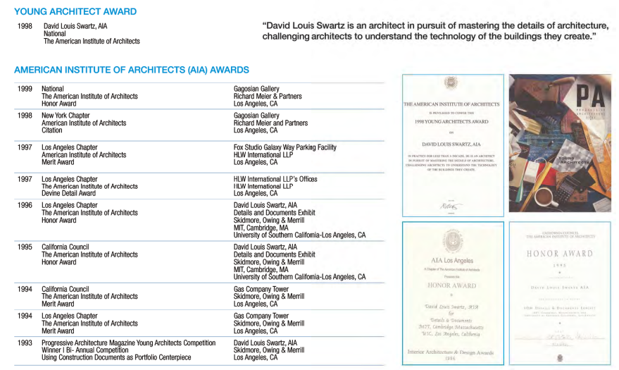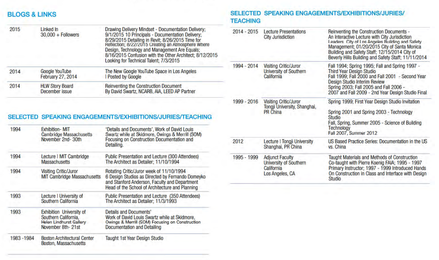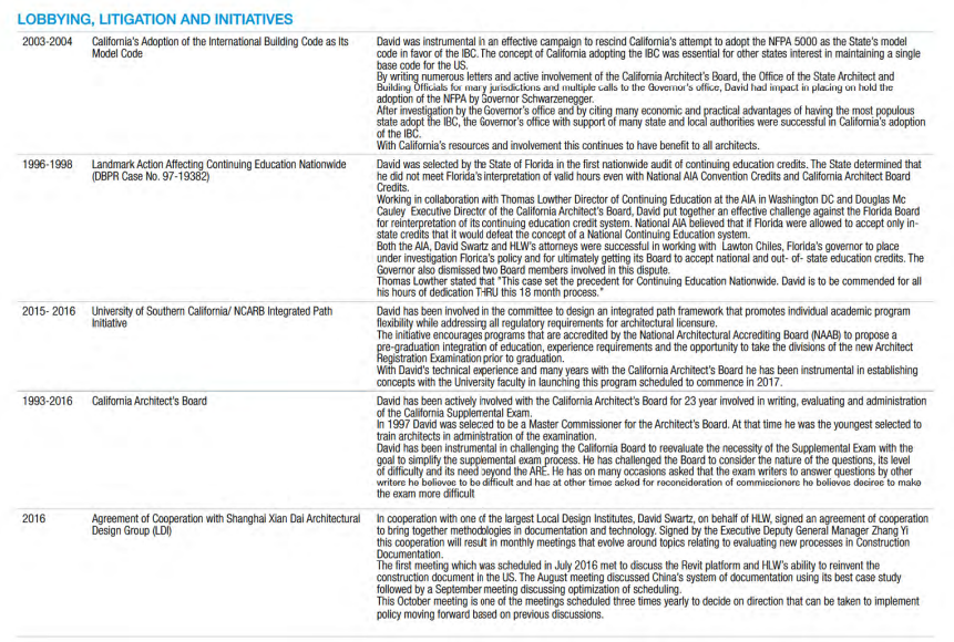 With over 40 years of experience, I am an expert witness and architect, renowned for my deep technical knowledge and innovative problem-solving skills in building codes and construction technology. My expertise has been a pivotal factor in securing multi-million dollar awards for clients, delivering extraordinary outcomes that exceed expectations and result in high satisfaction for attorneys. I am fully committed to working as a full-time licensed architect across multiple states. My selective approach ensures I engage with challenging and inspiring projects, consistently pushing the boundaries of architectural excellence. Over the years, I've been honored with more than 40 design awards, underscoring my dedication to quality and creativity in the architectural field. My career has also been marked by a profound understanding of construction documentation and detailing, which are crucial for successful project execution. Early in my career, I showcased my technical acumen in an exhibit at MIT and USC, highlighting architects' critical role in the architectural process. As a Fellow of the American Institute of Architects and a past recipient of the AIA's National Young Architect Award for technical excellence, I bring a balance of experience and forward-thinking innovation to each project. I have been referred to as the architect's architect. Pleas look on line at examples of my work. Education: University of Southern California, Master of Architecture, Phi Kappa Phi, 1989; Syracuse University, Bachelor of Architecture, 1982 Professional Specifications: Licensed Architect in California(C19729); Florida (AR12361); New York (028523); Washington State (7989); Oregon (4441); Nevada (7259); Massachusetts (9112); also: Illinois; Utah; Colorado; Louisiana; Missouri; Iowa; Minnesota, Tennessee; Arizona; National Council Architects Registration Board Certification (37680) Fellow of the American Institute of Architects (#30077197) Member of IIDA International Interior Design Associates (#1076451) Construction Specification Institute Master Commissioner for the California Architects Board 1995-2021; Member NFPA (National Fire Protection Agency); Member of the International Code Conference; LEED Accredited Professional. Board Appointments: USC Board of Governors Alumni Association 2021-2023; USC Architectural Guild 2018-2021; West Los Angeles Sawtelle Neighborhood Council Board Member 2023-2025; West Los Angeles PLUM Committee Chair 2020- 2025; California Architects Board Master Commissioner 1989- 2020. Employment History: The Lamar Johnson Collaborative 2021-present; HLW International LLP; Los Angeles CA 1995-2021; University of Southern California Adjunct Faculty; Los Angeles CA 1995-1997; Richard Meier & Partners; Los Angeles CA 1994-1995; SOM; Los Angeles CA 1988-1994; Robbins & Bown; Van Nuys CA 1986-1988; Gee & Jenson; West Palm Beach FL 1985-1986; Sumner Schein; Boston MA 1984-1985; Ecodesign Inc., Cambridge MA 1982-1984. Professional Awards: 2017 College of Fellows American Institute of Architects; The 1998 Young Architect Award American Institute of Architects; 2013 Los Angeles Business Council Award; 2012 Hospitality Design Awards (2); 2000, 2002, 2004, 2007,2009,2010,2012, 2015 Callibre Design Awards for Excellence in Design; 1997 AIA California Council Merit Award for the Galaxy Garage @ Fox Studios 1997 AIA Los Angeles Chapter ‘Divine Detail’ Award for HLW/ LA Office; 1996 Los Angeles Chapter Merit Award for ‘Details & Documents’ Exhibition; 1995 AIA California Council Honor Award for ‘ Details & Documents’ Exhibition; 1993 P/A Featured Young Architect with SOM Other awards listed in Linked in Profile: David Louis Swartz FAIA https://www.linkedin.com/in/david-louis-swartz-faia-iida-75813210/ Please also look at my body of work as published by the American Institute of Architect under https://content.aia.org/sites/default/files/2017-04/F2017_Swartz_David_reduced.pdf