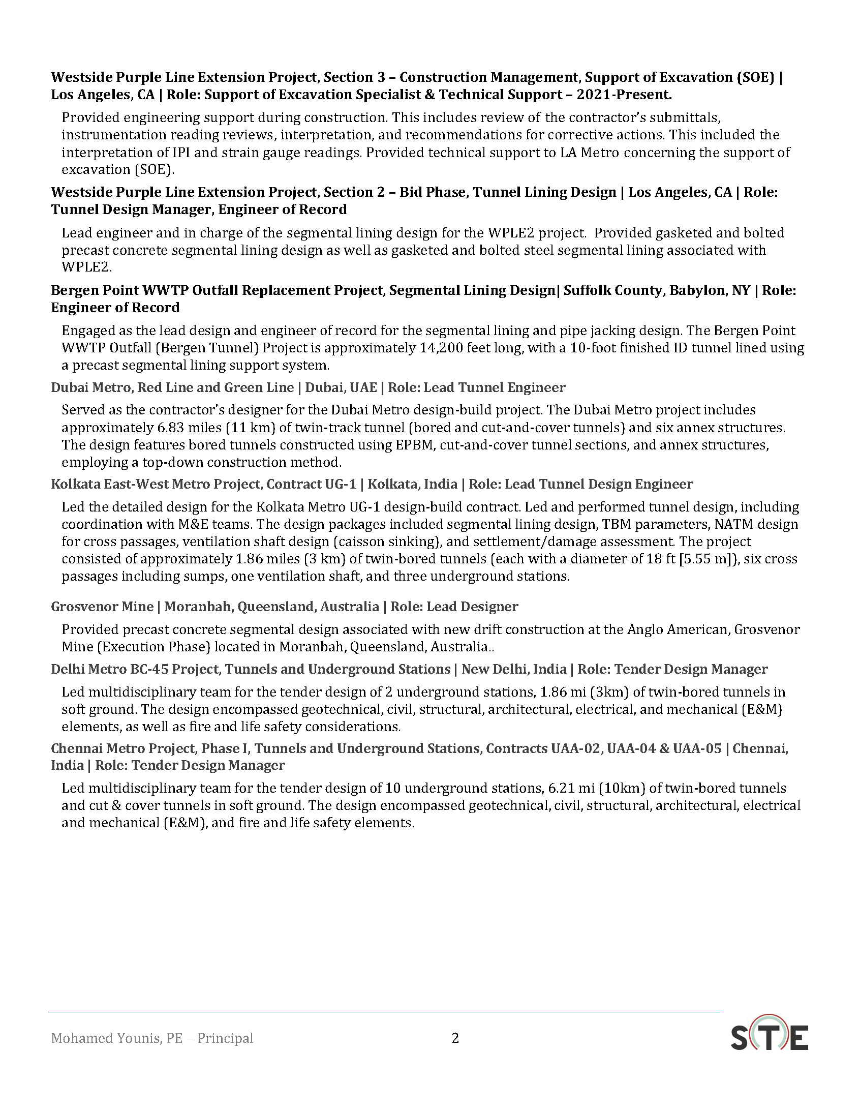 Provide expert litigation, arbitration, and mediation support, exclusively focusing on geotechnical engineering for complex, high-stakes subsurface, tunnel, and underground design and construction disputes involving complex projects. Recent engagements include but are not limited to: Providing expert litigation support and testimony on behalf of a county’s $1.6B transportation project in defense of claims brought by the general contractor (2025; ongoing); Provided expert litigation support to legal team hired by a top-tier design-build team to defend claims associated with a $1.4B transportation project (2022); Provided testimony on behalf of a contractor’s defense team in conjunction with a $2.4B transportation project (2018) Publications: Elisa Comis, Mohamed Younis, and Robert Goodfellow. Concurrent Segment Lining and TBM Design: A Coordinated Approach for Tunneling Success. Proceedings of World Tunnelling Congress (WTC) 2016, April 22-28, 2016, San Francisco, CA Moussa Wone, Mohamed Younis, Kevin Fu, and Brad Muray. Protecting Existing Infrastructure Near Shafts. Proceeding of the North American Tunneling Conference (NAT) 2014, June 22-25, 2014, Los Angeles, California. Moussa Wone, Mohamed Younis, Martin Ellis, and Paul Headland. Practical Method for Predicting Shaft Construction-Induced Settlement, Case History – The Blue Plains Tunnel Project. Proceedings of the Rapid Excavation and Tunneling Conference (RETC) 2013, June 23-26, 2013, Washington, DC. Paul Headland, Nate Strater, Mohamed Younis, and Dan Dobbels. Rock Mass Characterization for the WSSC Bi-County Water Tunnel. NAT 2008, June 7 – 11, 2008, San Francisco, CA. Paul Headland, and Mohamed Younis. Now What? The Soils Spring some Surprises during Trenchless Construction. Water & Environment Technology, April 2008. Paul Headland, and Mohamed Younis. Resolving Claims for Microtunneling - A Case History of the Arlington Cemetery Stormwater Outfall Tunnel. WEFTEC 2007, October 13 – 17, 2007, San Diego, CA. Madsen, Paul, Mohamed Younis, V. Gall, and Paul Headland, 2007. NATM through Clean Sands–The Michigan Street Experience. Proceedings of the Rapid Excavation and Tunneling Conference (RETC) 2007, June 10-13, 2007, Toronto, Canada. Younis, Mohamed and Robert Goodfellow, 2006. Soft Ground Tunnel Displacement due to Foundation Excavation – A Case History of the Federal DOT Building in Washington DC. Proceedings of the North American Tunneling (NAT) Conference 2006, June 10-15, 2006, Chicago, Illinois. Headland, Paul and Younis, Mohamed, 2006. Ground Deformation and Structure Stability in Highly Stressed Rock Formations. ARMA Golden Rocks 2006, June 17 – 21, 2006, Golden, Colorado. Richardson, Tom, Mohamed Younis, and Paul Headland, 2003. Geotechnical Investigations for Trenchless Technology. Proceedings of the ASCE International Conference on Pipeline Engineering and Construction, July 2003, Baltimore, Maryland. Younis, Mohamed and Robert Goodfellow, 2003. The Design and Construction of Multiple Closely Spaced Tunnels in Soft Ground, A Case History of the MAC Storm Tunnel Project. Proceedings of the Rapid Excavation and Tunneling Conference (RETC) 2003, June 16-18, 2003, New Orleans, Louisiana. Younis, Mohamed A., Brian H. Zelenko, and Christopher Dumas, 2001. Ground Improvement Feasibility Study for Large Highway Projects, A case Study of the Woodrow Wilson Bridge Replacement Project. Proceedings of the “2001 A Geo-Odyssey” on Foundations and Ground Improvement, June 9-13, 2001, Blacksburg, Virginia.