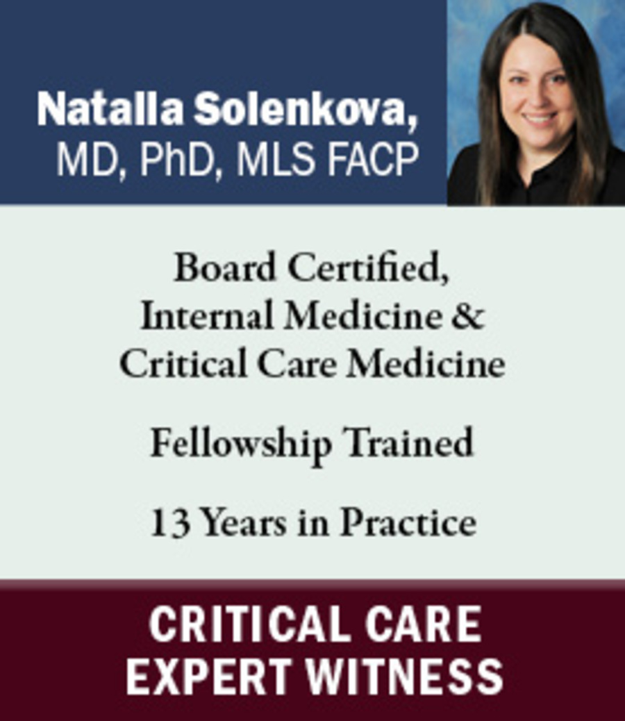 The SEAK Expert Witness Directory contains a comprehensive list of critical care medicine expert witnesses who testify, consult and provide litigation support on critical care medicine and related issues. Critical care medicine expert witnesses and consultants on this page may form expert opinions, draft expert witness reports, and provide expert witness testimony at deposition and trial. The issues and subjects these critical care medicine expert witnesses testify regarding may include: Trauma, Acute Care, Airway, Aviation Medicine, Blood Transfusion, Cardiac, Cesearean, Credentials/Privileging, Critical Care, Emergency, Endoscopy, Epidural, Global Health, Healthcare Leadership, and Healthcare Quality.